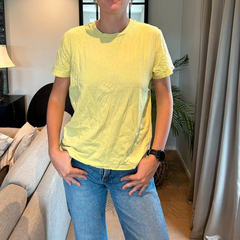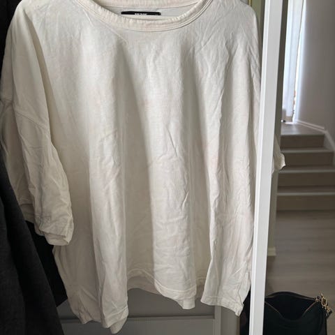 Hvit Bik Bok T-skjorte i størrelse XL, hovedsakelig Modal materiale. Laget i strikket elastisk materiale.