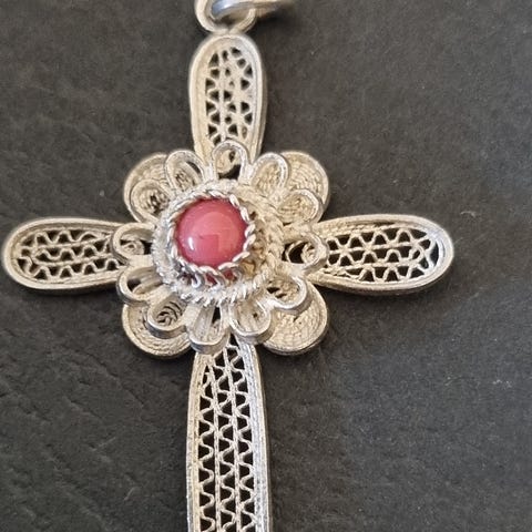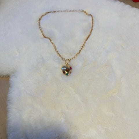 Selger et smykke som har vært i slekta langt tilbake i tid. Mål 7 cm høyt og 5 cm br. Like fint. Belagt med store og små stener. Vet ikke av hva. Små sorte og store gyldne stener, Kan sendes.