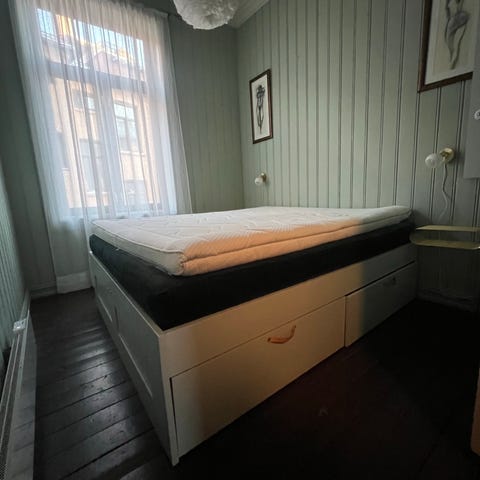 • Inkluderer: Seng. Madrass inkludert, jeg har aldri sovet direkte på madrassen, har sovet på overmadrass som også kan bli med på kjøpet, valgfritt.