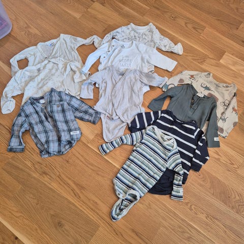 Liten klespakke i størrelse 62 (2-4 måneder). Ny og ubrukt, kun vasket. Én omslagsbody fra H&M, én kortermet body fra name it, grønn snekkerbukser fra Topomini og to par sokker.