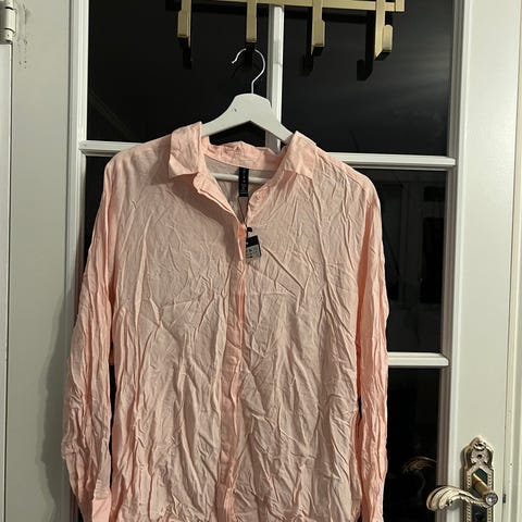 Skjorten har klassisk krage, knappestolpe foran og lange ermer med mansjetter.