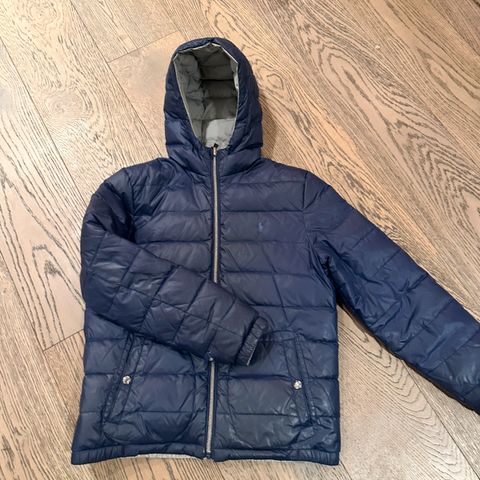 Ralph Lauren Polo Performance vinterjakke i størrelse 8 for gutt. Jakken er grønn med detaljer i blått og laget av polyester. Den har hette og glidelås.