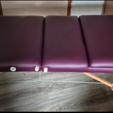 Massasjebenk i brun skinn med justerbar høyde. Lengde 190 cm, bredde 67 cm. Høyde kan justeres fra minimum 60 cm til maksimum 88 cm. Benken har utskjæring for ansikt og polstrede seksjoner for komfort.