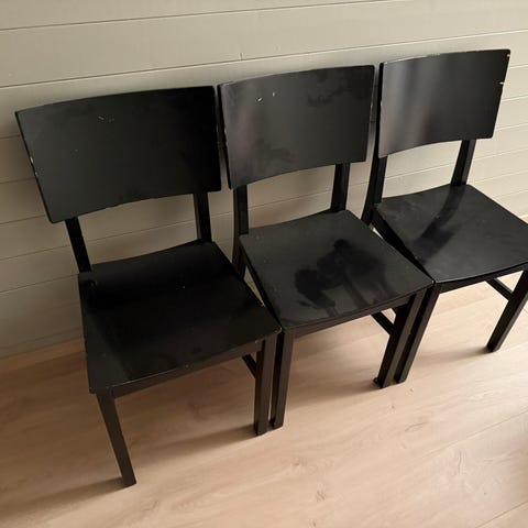 Stolene er pent brukt, med noen ubetydelige overfladiske bruksmerker. Den ene stolen har løs støtte i det ene benet og gis derfor med de andre tre.