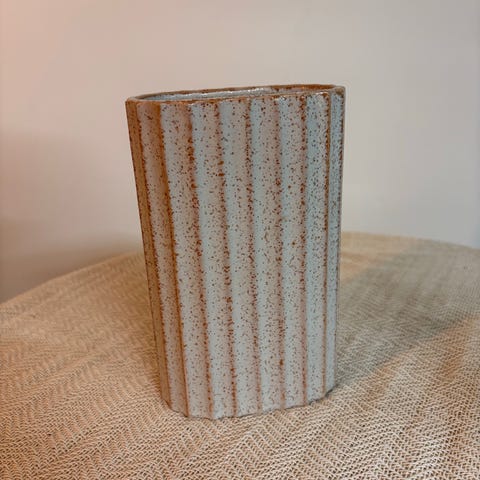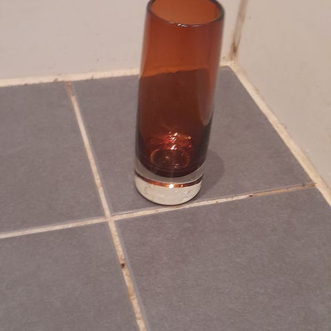 Jysk dekorasjonsvase laget av glass med en spiralformet design. Vasen har en brunfarget nyanse og en unik form som kan brukes til dekorasjon i hjemmet.