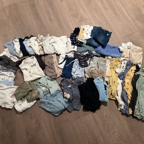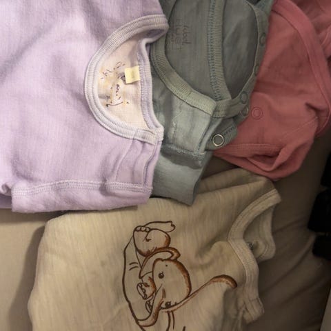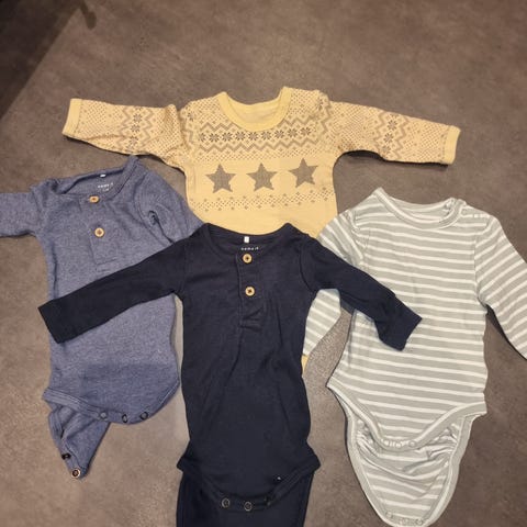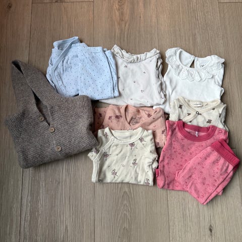 To like sett i str 56, brukt som ekstra klær i stellevesken. Fra nameit