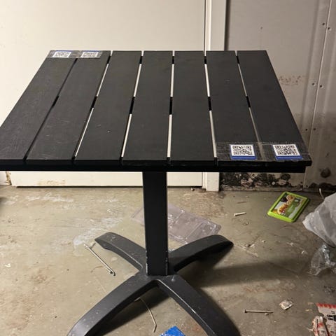 Kafébord og to stoler i metall og rotting