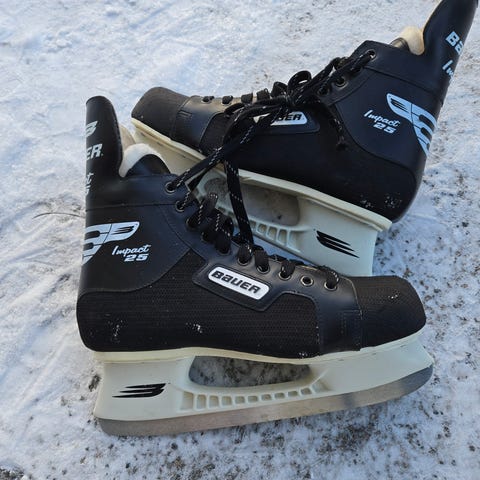 Bauer ishockeyskøyter i størrelse 42. Skøytene har svart farge med hvite og røde detaljer. Designet for ishockey med stålblad og snøring for god passform.
