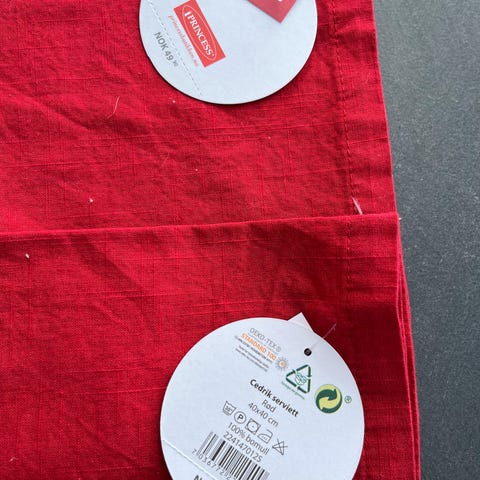 4 stk helt nye tøyservietter i ubleket bomull med røde striper. 30x30 cm