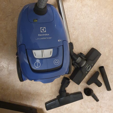 Det kommer en lukt av sagmugg når en støvsuger etter at dette ble støvsugd uten støvsugerpose i sommer. Dette løses nok helt sikkert med å bytte filter. Ellers er den i tipp topp stand.