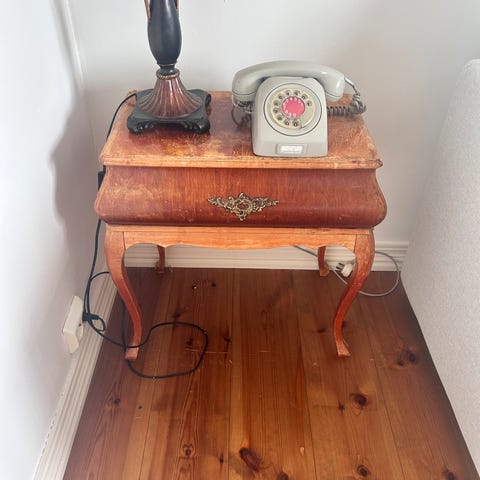 Reproduksjon i vintage-stil (ikke antikk). Pent brukt, med noe alders-/brukspreg. Selges som dekor, fungerer ikke som telefon.