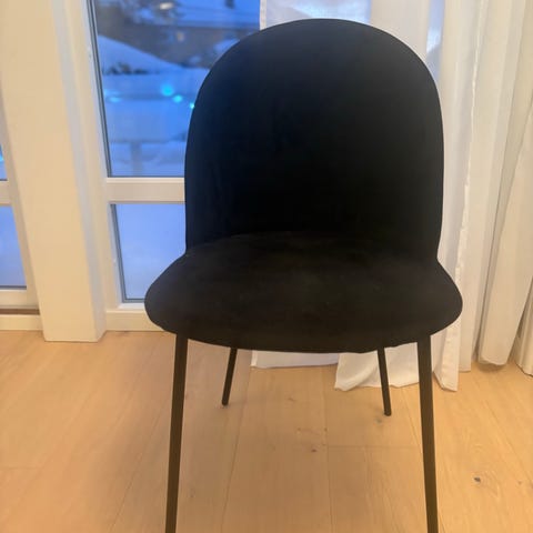 Lekker stol med velurtrekk i skogsgrønn farge. Stolbena er malt i samme farge som stoltrekket, noe som gir et harmonisk inntrykk. Stolen er lite brukt.
