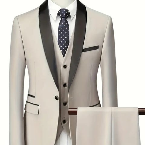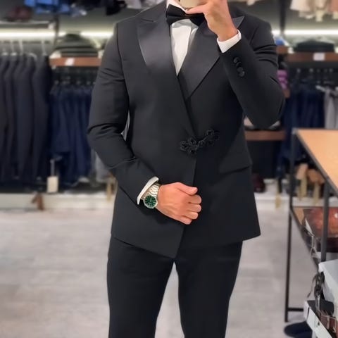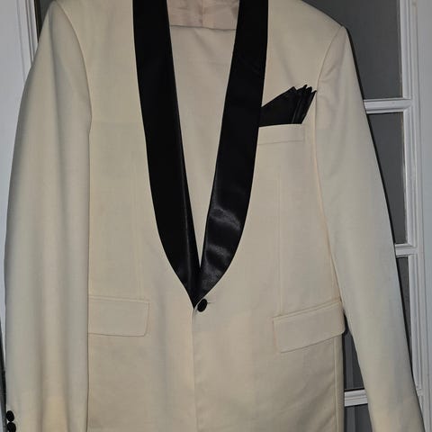 Selger smoking bestående av jakke, vest, bukse og milkehvit skjorte.