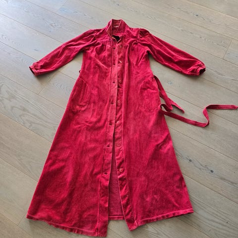 Selger en dødskul badekåpe/morgenkåpe. Den er arvet av bestemor, så den er skikkelig retro. Har lommer og knytting i livet. Laget av håndklestoff, så vil tro det er bomull.