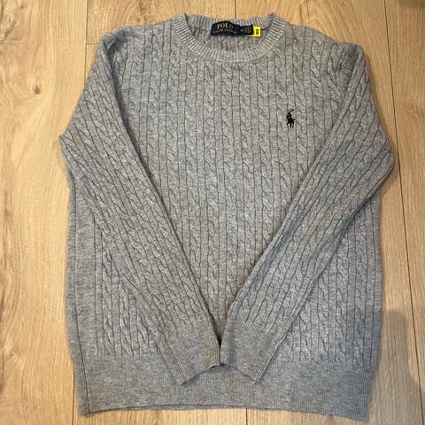 Ralph Lauren Polo genser i størrelse M, grå farge, laget av bomull. Genseren har kabelstrikket mønster og glidelås i halsen, designet for menn.