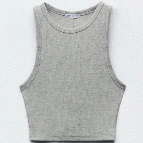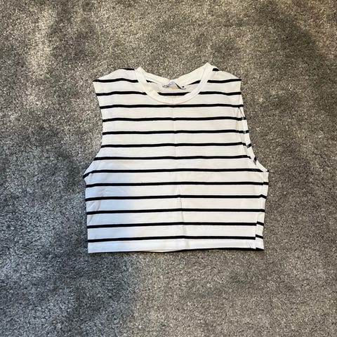 Zara tanktopp i størrelse S, hvit farge med svarte striper. Laget av 80% viskose, 18% nylon og 2% elastan.