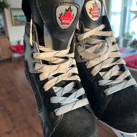 CCM Canade ishockeyskøyter for barn i størrelse 33. Skøytene er designet for ishockey og har svart, hvit og rød fargekombinasjon. Passer for barn som spiller ishockey.