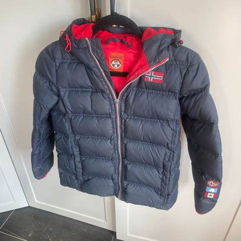 Pent brukt jakke, bortsett fra et lite hull på innsiden av det ene ermet. Litt liten i størrelse. Passer ca. 8 år.