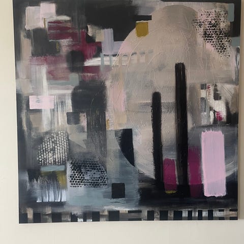 Signert originalt maleri med abstrakt motiv som viser fire figurer i ulike størrelser. Maleriet har en fargepalett bestående av grønt, gult, hvitt og svart, og er profesjonelt innrammet i en sølv/sort tre-ramme.