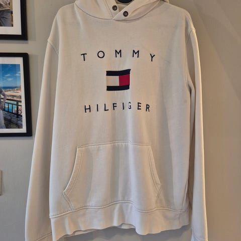 Lite og pent brukt Tommy Hilfiger hettegenser i blå farge, størrelse L, laget av bomull. Fin klassisk hettegenser som går aldri av moten.