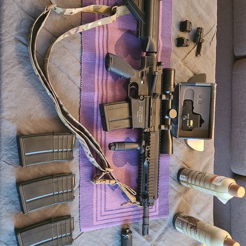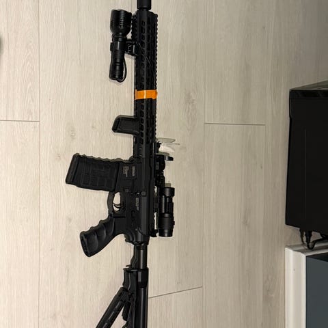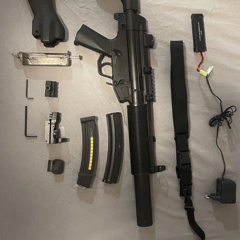 Selger div. Airsoft + 2 kniver. Følger med en god del kuler og ekstrautstyr. 10 000kr for alt