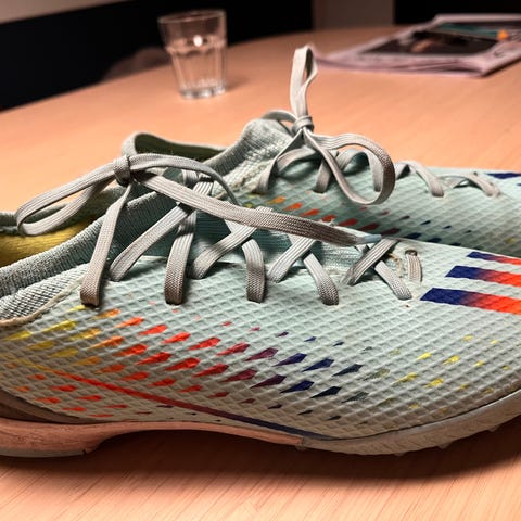 Adidas X Speedflow fotballsko i størrelse 35. Fargene inkluderer hvit, rød og neon gul. Skoene har knotter under sålen for bruk på gressbaner/kunstgress. Materialet er lett og designet for fotballspillere.