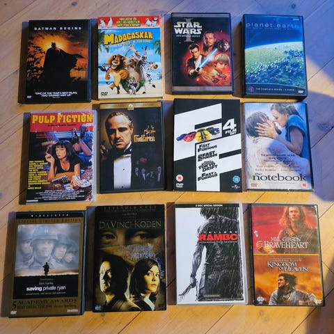 Samling av DVD-filmer med ulike titler og sjangre. Inneholder filmer som 'SVK', 'De Utrolige', 'Air Race', 'Unstoppable', 'G.I. Joe', 'Watchmen', 'Argo', 'Dracula' med flere. Formatet er DVD, og innholdet spenner over flere ulike filmtyper og temaer. Og CDer av div. noe er uåpna og noe godt brukt. Pris er stykk pris kan og bli enig på pris for alt
