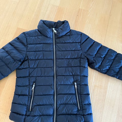 Cubus tynn/lett dunjakke i størrelse 152. Jakken er svart og laget av dun, med hette og glidelås foran. Hull på arm som er lappet - se bilde.
