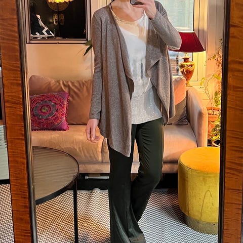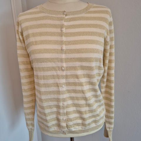 Lang cardigan med belte i livet, små lommer foran. Str s.