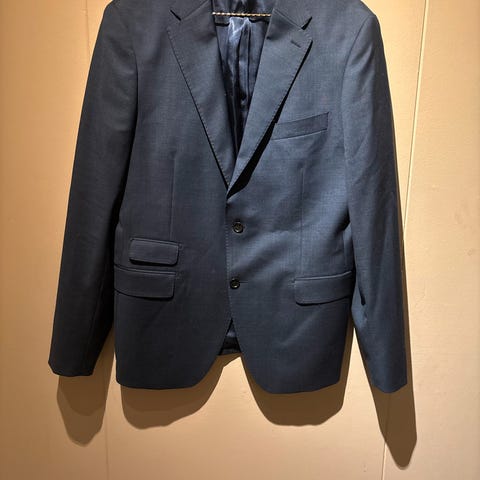 These Glory Days M linjakke i mørk blå farge. Jakken er laget av lin og har en klassisk design med knappelukking og krage. Egnet for menn i størrelse M eller L, litt avhengig.