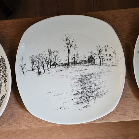 10 Tønsberg-tallerkener, komplett serie 1978-1987, selges. Motiver fra Tønsberg av Gunnar Berg Johansen. Produsert av Figgjo Norway.