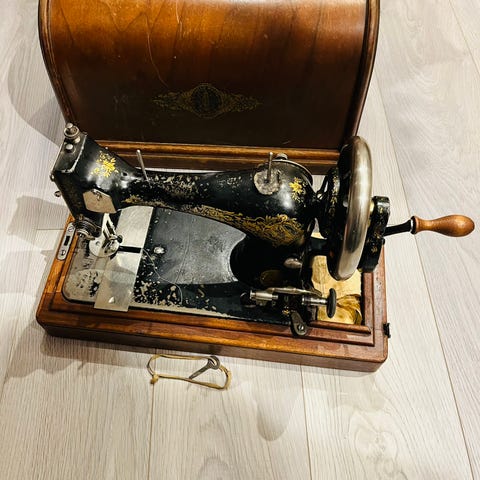 Eldre Singer symaskin elektrisk. Med koffertlokk og nøkkel