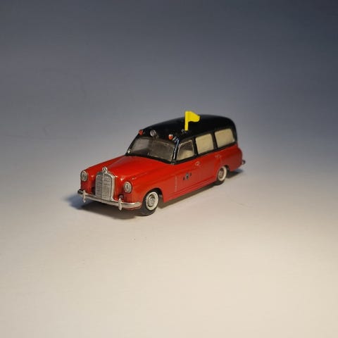 Fire modellbiler laget i metall med detaljerte karosserier og forskjellige farger: beige med rød tak, grønn med rød tak, og rød med beige seter. Modellene varierer i design og størrelse, og kan være egnet for samlere eller som dekorative gjenstander.