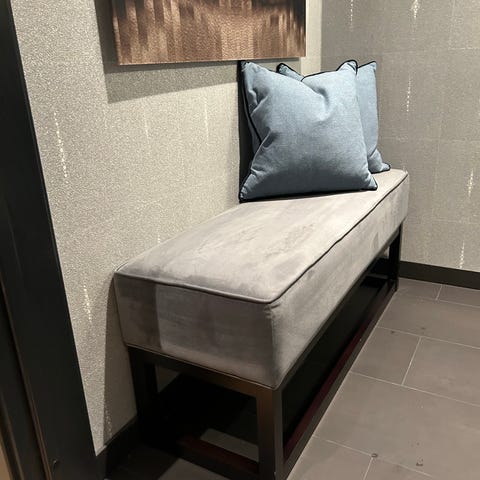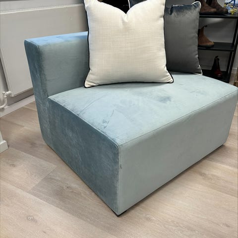Fin puff med stlitesterkt velur-aktig stoff i Marine. Godt polstret sete og god sittekvalitet. Perfekt til stue, gang eller inngangparti. Stoffet har noen små, lite synlige flekker. Beina er sortmalt tre. Solid byggekvalitet. Nypris kr. 5500,-
