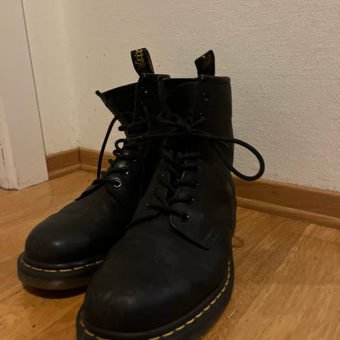 Dr. Martens sko i størrelse 45, svarte. Skoene har en solid såle og semsket skinn. De er svært lite brukt, og har stått i hylla i flere år. De er relativt tunge, med kraftige såler og en litt retro look.