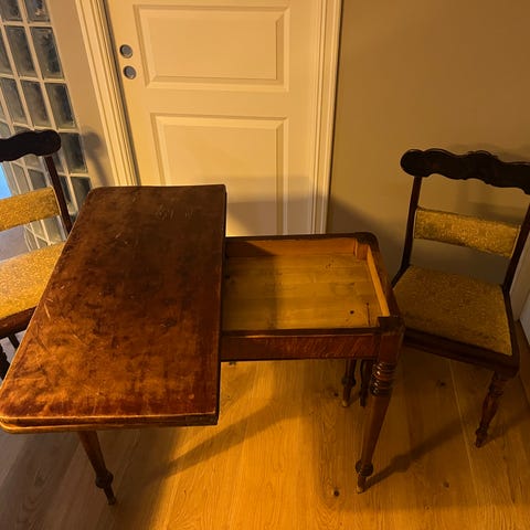 Antikk rundt sidebord laget i tre med dekorative detaljer på bena. Bordet har en polert overflate med synlige årer i treverket, noe som gir det et klassisk utseende. Passer som et mindre bord i stue eller gang.