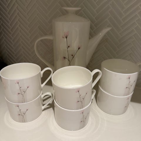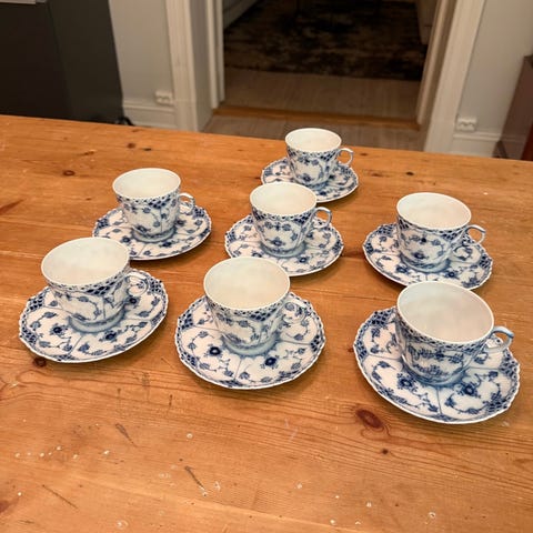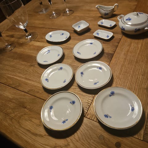 Royal Copenhagen servise i porselen med blå blomsterdekor. Sett inkluderer ulike tallerkener, skåler og serveringsfat, alle med karakteristisk blå blomsterpynt. Middagstallerkener 8 stk, asjetter 8 stk, suppe 10 stk, 1 serveringsbolle m/lokk, 2 sausboller, 1 rundt fat, serveringsfat i 3 str, et lite hakk av i hjørnet på det største. Må hentes. Vipps betaling