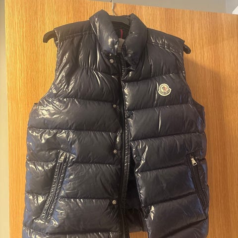 Hei, selger en Moncler Maya jakke, mørke blå med glossy finish. Jakken er 100 % ekte, og original kvittering følger med. Den ble kjøpt for ca. 1 år siden og fremstår som helt strøken uten noen form for bruksmerker. Glansen i stoffet er intakt, ingen slitasje på logo, glidelås eller sømmer (akkurat som en helt ny).
