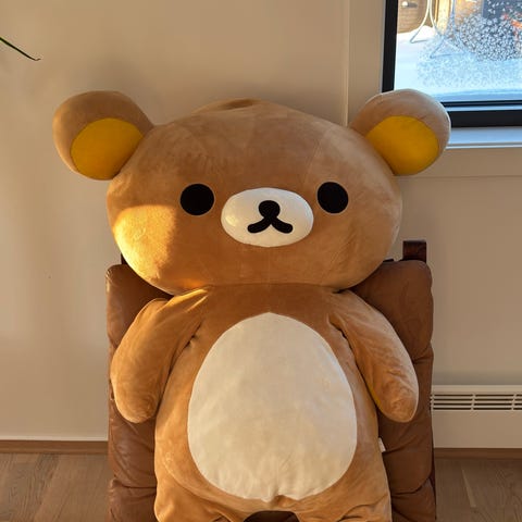 Ole Brumm bamse i gul farge med rød genser. Myk og stor kosedyrfigur basert på Ole Brumm-karakteren. Selges for 150kr. Ser ny ut