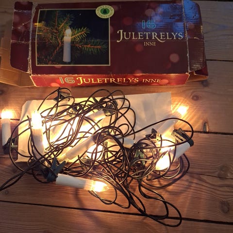 En julelot bestående av lyslenke med batterier, nisser og magneter