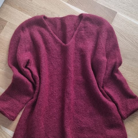 Det er noen små brune merker nederst på genseren og på høyre erme (se bilde). Dette er lite synlig i bruk, siden fargen er melert. Pris er satt deretter