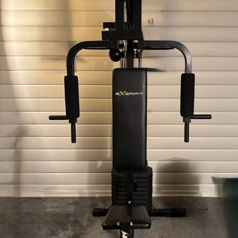 Multigym treningsapparat med vektstang, puter for støtte og håndtak for ulike øvelser. Egnet for styrketrening hjemme.