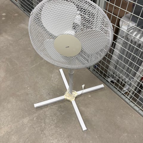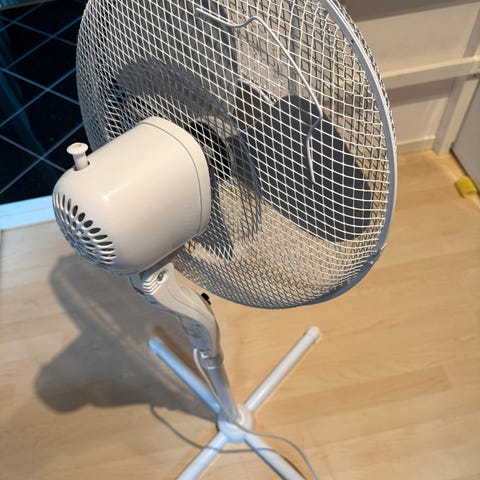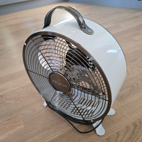 Bordvifte i hvit plast med beskyttelsesgitter. Passer til bruk i hjem eller kontor for luftsirkulasjon.