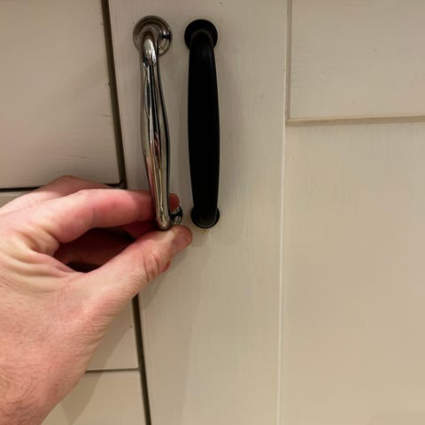 Godt brukte håndtak. Opprinnelig farge er gull. Brukt svart benglakk fra obs bygg. Den har begynt og svertte av.