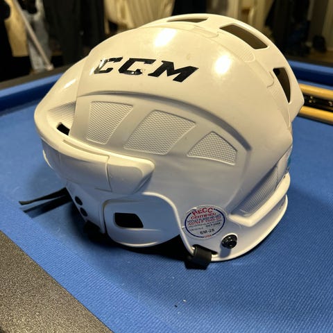 CCM ishockeyhjelm med avtagbart bur. Hjelmen er svart og designet for ishockeybruk. Den gir beskyttelse til hodet og ansiktet under ishockeyspill.