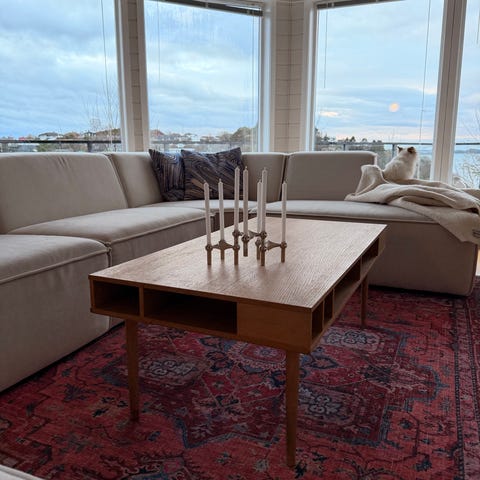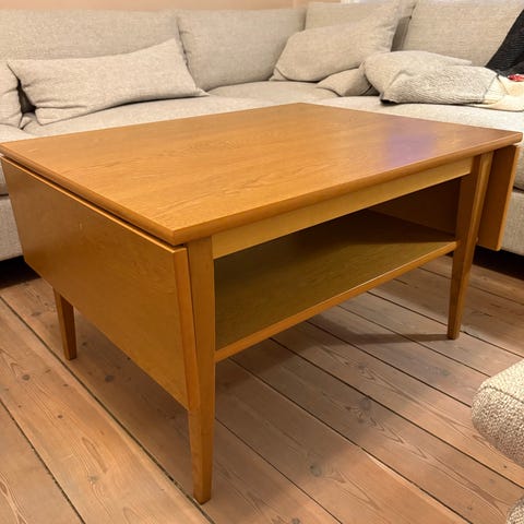 Meget fint sofabord i eik. Kan pusses og oljes i ønsket farge. Pent brukt. Nypris var over 10.000,-. Ca 70x70 cm.