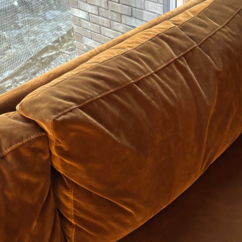 Sofaen har fått en rift i filten under - dette påvirker ikke sofaens funksjon. Sofaen er litt nedsunket i sjeselongdelen. Den er meget pent brukt mtp. stoffet.