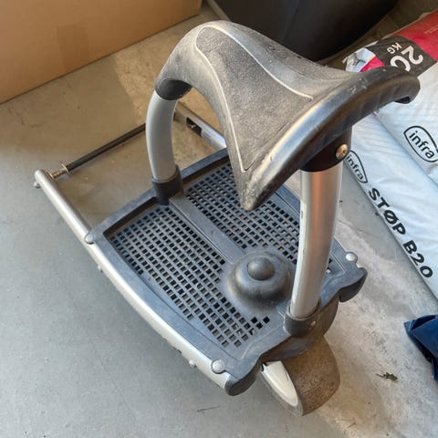 Stoffet er ødelagt på små steder (se bildet) og det mangler 1 skru (se bildet). Jeg har ikke merket at det påvirker bruken av vognen, annet en det er den i ok stand. Men selges derfor billig, men det er mye bruk igjen på vognen :), julene er i bra stand.