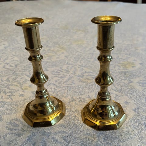 To antikke lysestaker i patinert bronse i Louis XVI stil.