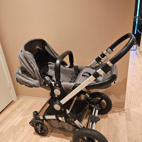 Vognen er brukt som reisevogn ved to ferier, vi hadde da vognen i kofferten da den blir nokså flat. Har stått innendørs nå frem til salg. Kan legges helt ned og barnet kan sitte. Kappen gjør at det blir svært bra solskjerming.